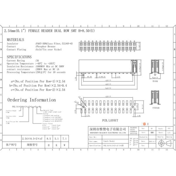 PA6T UL94V-0 2.54Mm Double Row SMT Female Header H=8.5Mm Standard Connector